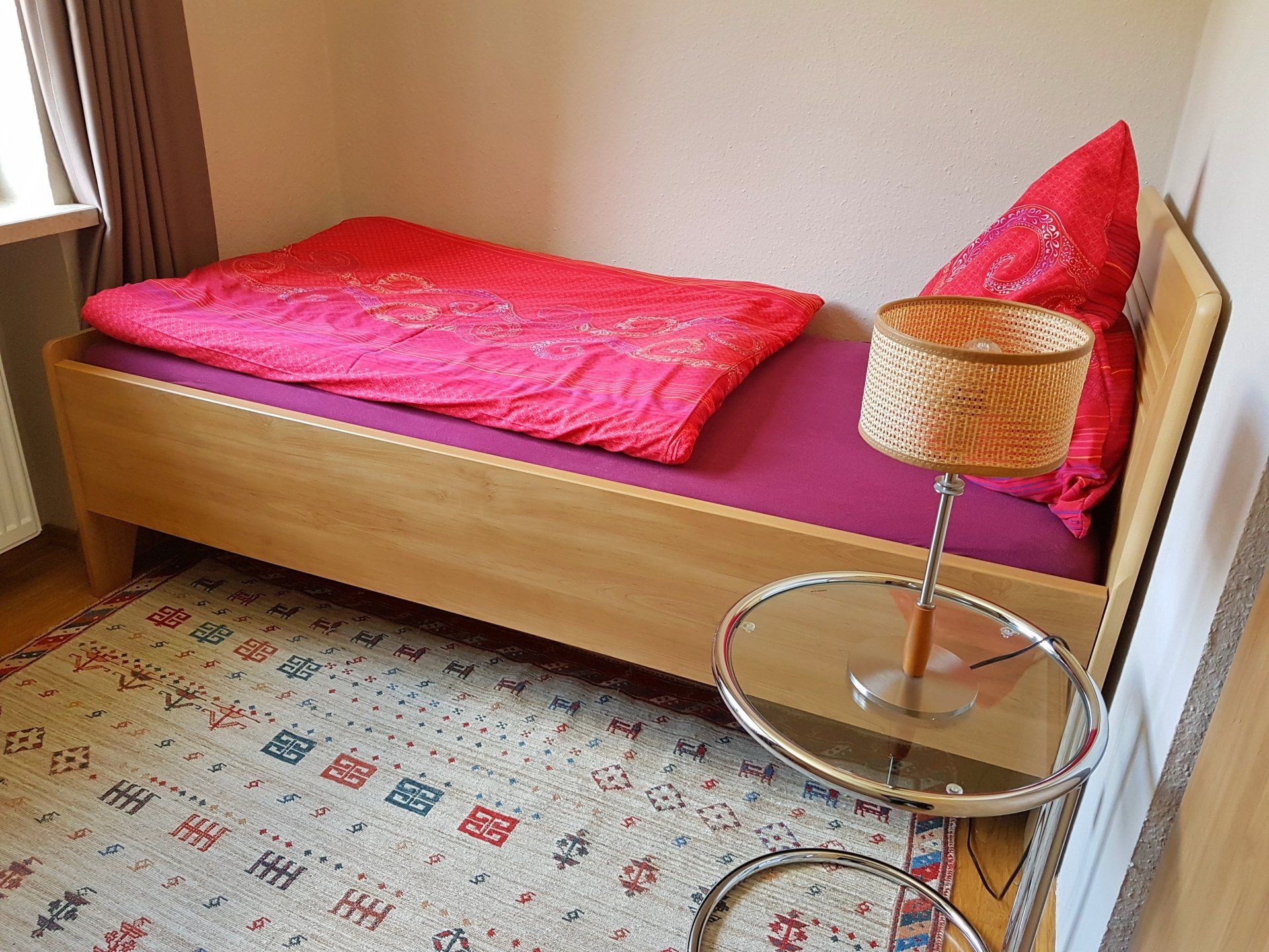 The apartment features high-quality furniture of polished wild oak, authentic oriental carpets, a cosy balcony with teakwood furniture as well as elegant blackout curtains in earthy shades.