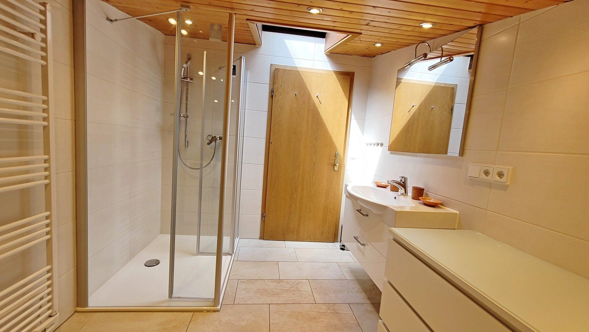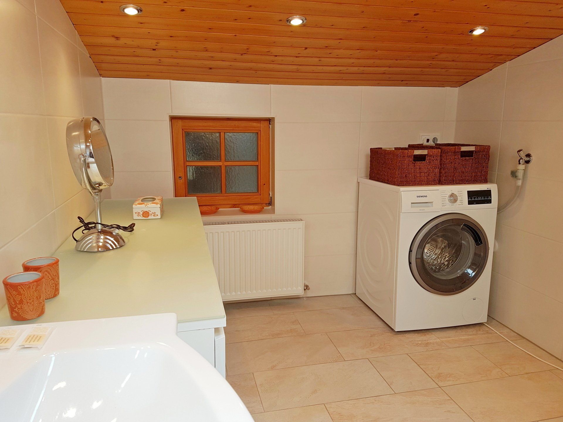Bad mit Dusche, Waschbecken, Waschmaschine und Trockner zur kostenlosen uneingeschränkten Nutzung, Kosmetikspiegel, große Kommode. Selbstverständlich auch Dusch- und Handtücher, Fön. Separates WC mit Handwaschbecken und Spiegel, Außenfenster.