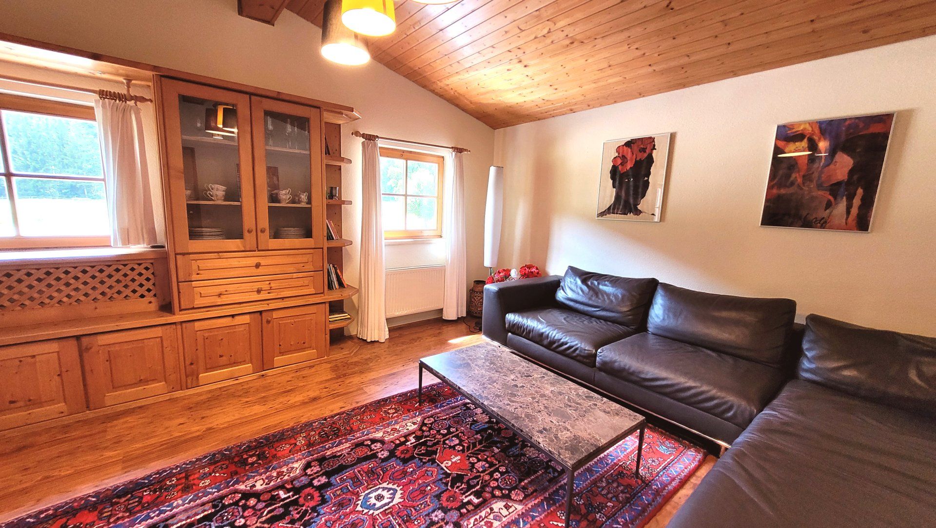 Großes Wohnzimmer mit Leder-Couchgarnitur, Orientteppich, Flatscreen-TV, DVD-Player, Schrank- und Regalwand aus massivem Holz mit einer reichen Auswahl an Ferienlektüre, DVDs, Büchern und Spielen.
